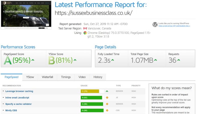 To perform a speed test of your chosen theme, just head to a speed testing site such as GTMetrix and copy and paste the URL of the homepage in to run a speed test. You should get some results like the following: